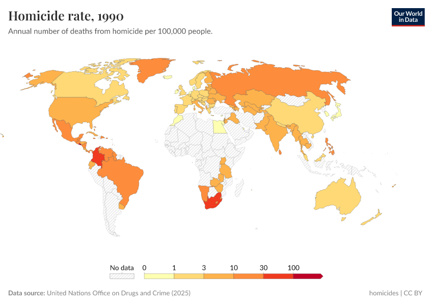 UN, World Population Prospects (2024); United Nations Office on Drugs and Crime (2025) – with major processing by Our World in Data. “Homicide rate per 100,000 population” [dataset]. United Nations Office on Drugs and Crime, “United Nations Office on Drugs and Crime - Intentional Homicide Victims”; United Nations, “World Population Prospects”; Various sources, “Population” [original data]. Retrieved July 11, 2025 from https://mdim-pisa.owid.pages.dev:8789/20250624-125417/grapher/homicide-rate-unodc.html (archived on June 24, 2025).