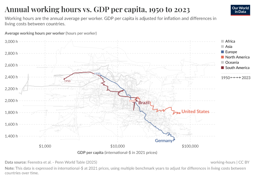 The four highlighted countries exemplify how working hours have decreased at the same time that average incomes have increased. Germany, for example, moved far to the right as its GDP per capita increased more than 10-fold, and far to the bottom as working hours nearly halved.3