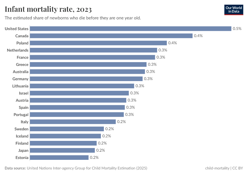 Infant mortality – the share of infants that don’t survive the first year of their life – is higher in the US than in just about every other rich country. You can again add countries to the chart here. High infant mortality matters very much for life expectancy as the very short life span pulls down the average strongly.